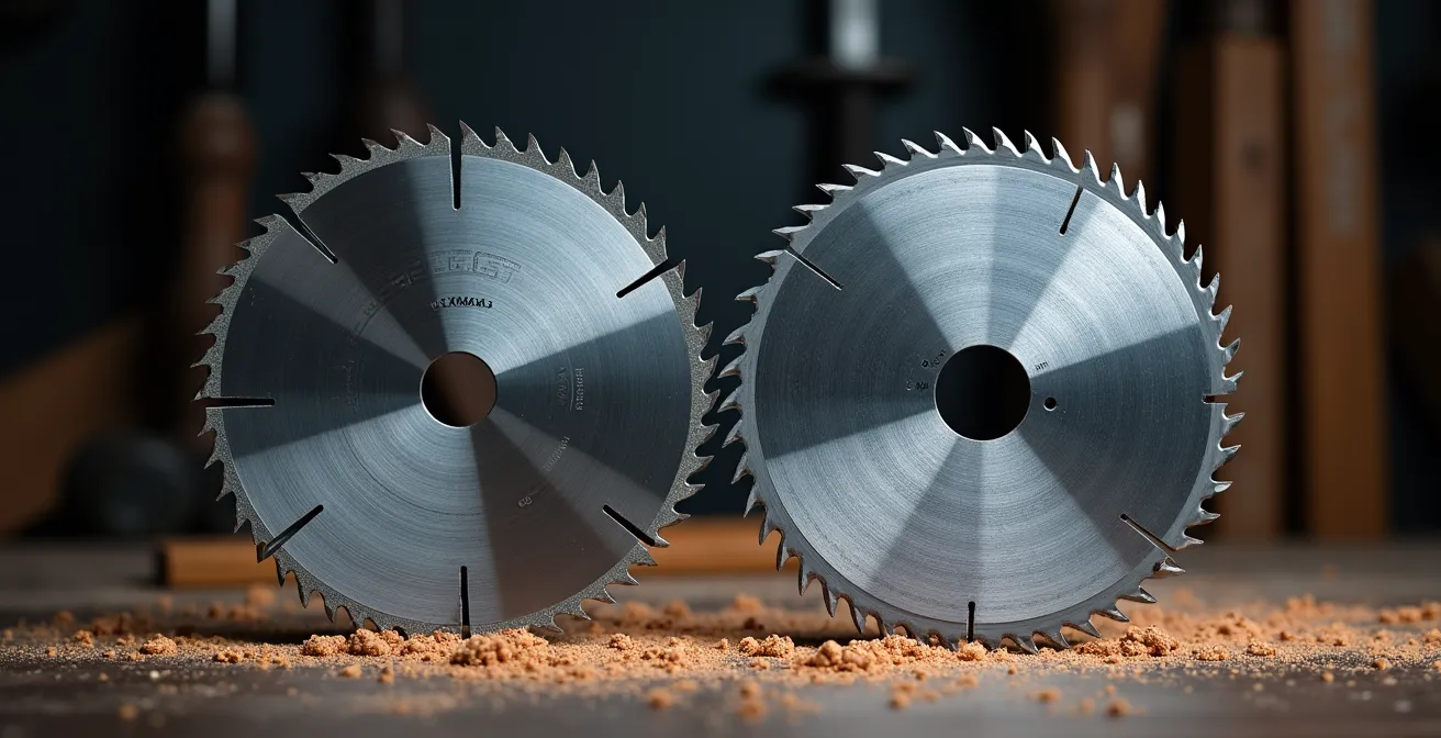L’idée reçue la plus tenace dans l’atelier est que « plus il y a de dents, plus la coupe est fine ». Si cette affirmation est globalement vraie pour les matériaux composites comme le stratifié, elle est contre-productive pour le délignage de bois massif et révèle une incompréhension de la physique de la coupe. Le facteur décisif n’est pas seulement le nombre de dents, mais la charge de travail par dent et la capacité d’évacuation des copeaux. Une lame de 24 dents possède de grandes « chambres » entre chaque dent, conçues pour évacuer rapidement les gros copeaux produits lors du délignage dans le sens du fil du bois.